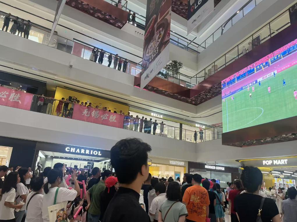 在位于無錫市濱湖區的一家商場內,顧客正在大屏下觀看“蘇超”比賽。新華社記者 何磊靜 攝