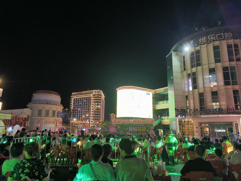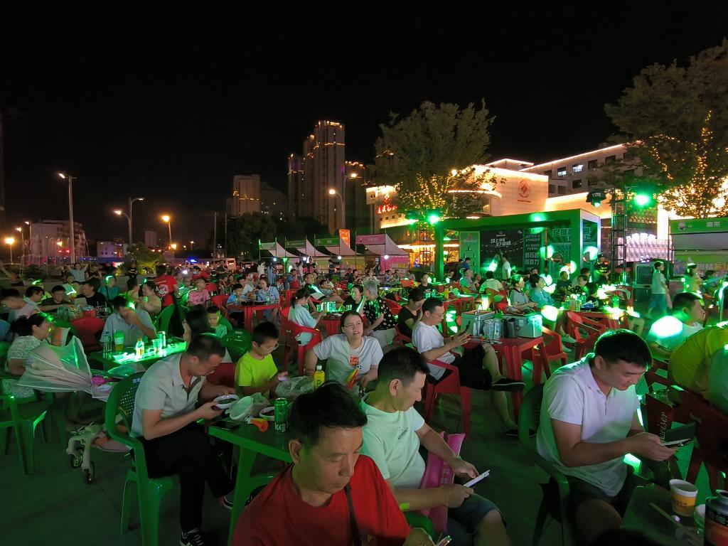 在位于無錫市濱湖區的湖濱商業街東廣場,人們邊看球邊品嘗美食。新華社記者 何磊靜 攝