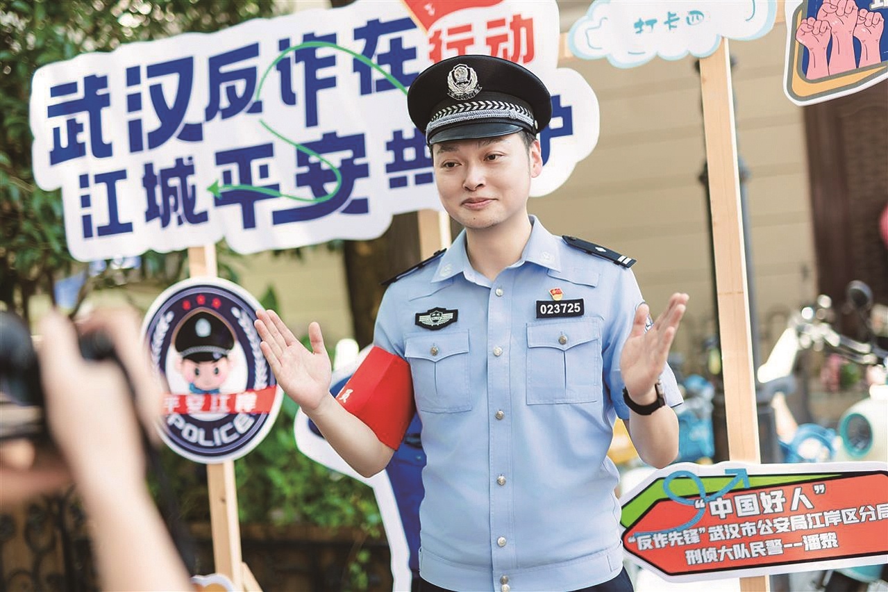7月8日,潘黎和同事們來到江岸區黎黃陂路步行街“巴公房子”網紅打卡地,開展“全民反詐在行動”系列主題宣傳活動。潘黎手中的毛絨“警察小熊”,自制錄音不停地用武漢話說:“陌生電話要警惕,可疑短信要注意。任憑騙術千萬變,不貪便宜不受騙……”引來行人紛紛駐足。
