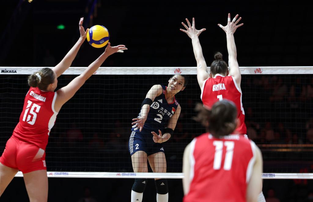 圖為6月5日在北京舉行的2025年世界女排聯賽(中國北京站)小組賽中,中國隊對陣波蘭隊的畫面。新華社記者 雒圓 攝