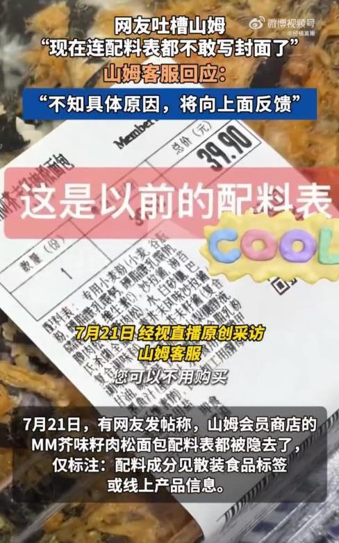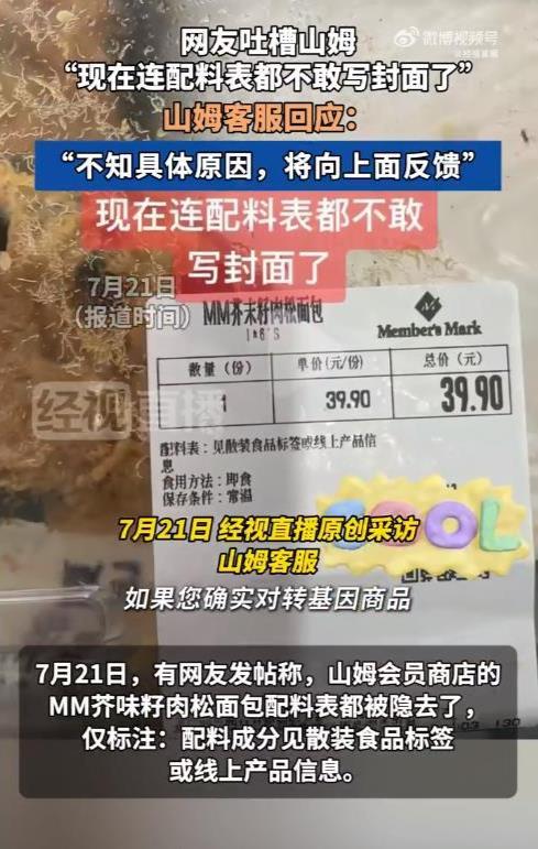 7月21日,有網友發帖稱,山姆會員商店的MM芥味籽肉松面包,以前的外包裝上標注了配料表,現在改用新配方后,線下售賣的該產品外包裝上,配料表都被隱去了,僅標注:配料成分見散裝食品標簽或線上產品信息。而在網友之前展示的線下售賣的該商品的配料表中,并不包含線上配料表中所展示的“轉基因大豆油”成分等,此事引發網友熱議。