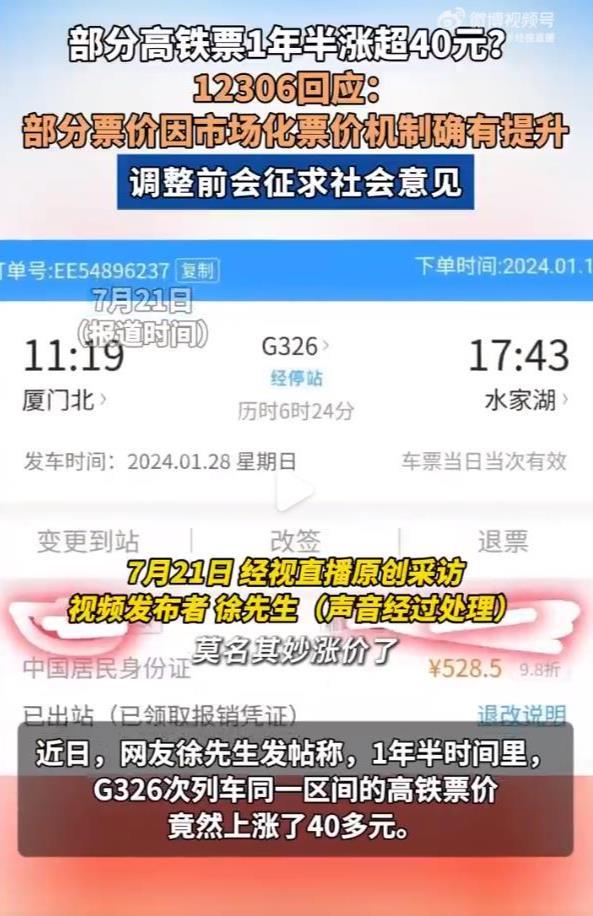 近日,網友徐先生發帖稱,1年半時間里,G326次列車同一區間的高鐵票價竟然上漲了40多元,引發公眾對高鐵票價調整機制的關注。