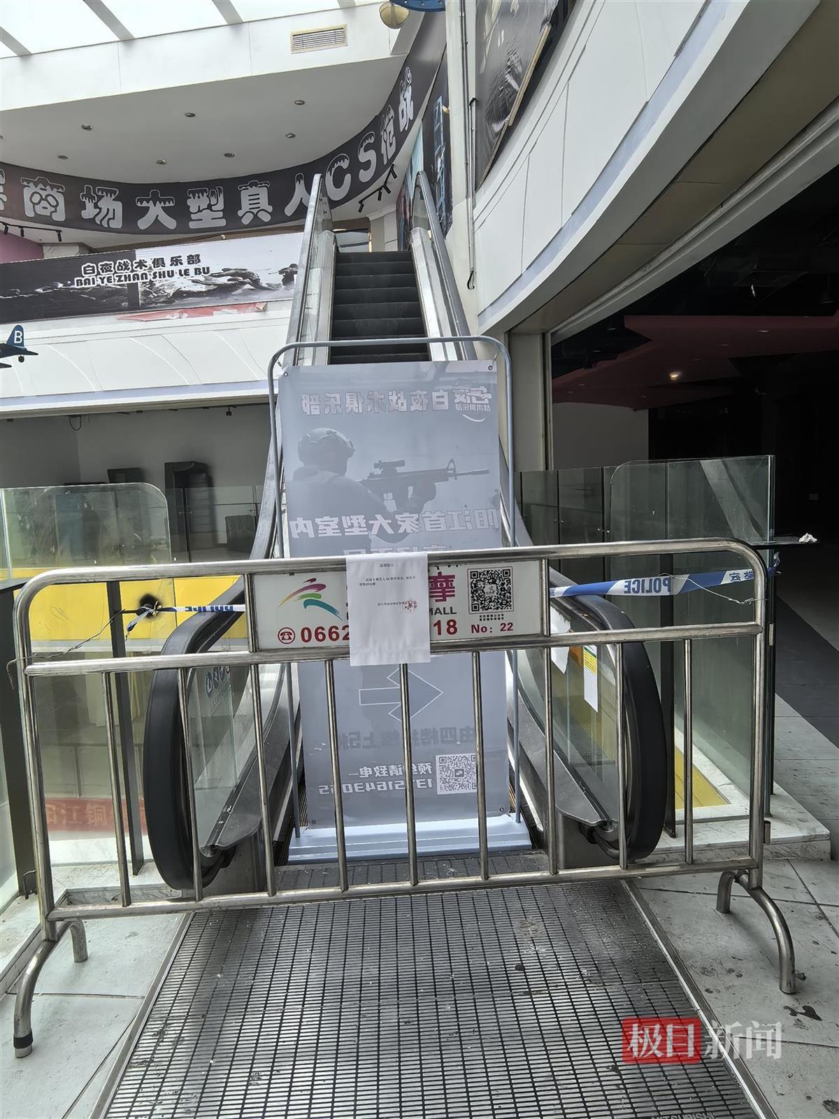 在商場大門上方和電梯入口處、電梯內,均有這家真人CS商家的廣告、路線指示牌。商場的直達電梯只能到四樓,再通過一個扶梯上五樓,但如今進入五樓的扶梯入口已經封閉,并張貼著真人CS店暫停營業的通知,落款時間為7月17日。