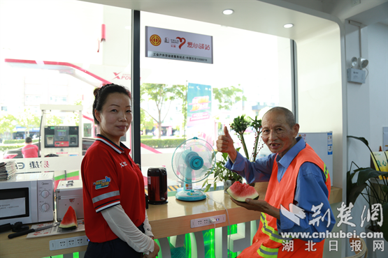 在荊門石油公司月亮湖加能站的愛心驛站內,空調全力運轉,為戶外工作者營造出涼爽舒適的環境。便利店外精心設立了“愛心小桌”,上面擺滿了冰鎮飲品、解暑綠豆湯等清涼食品,為奔波忙碌的外賣騎手、環衛工人等提供便捷。同時,醫藥箱也被放置在站內方便拿取的地方,以備不時之需。一位前來納涼的環衛工人感激地說:“這天氣熱得讓人受不了,多虧了有愛心驛站,能讓我們進來歇歇腳、喝口水、吃塊瓜、降降溫,中石化真是想得太周到了!”