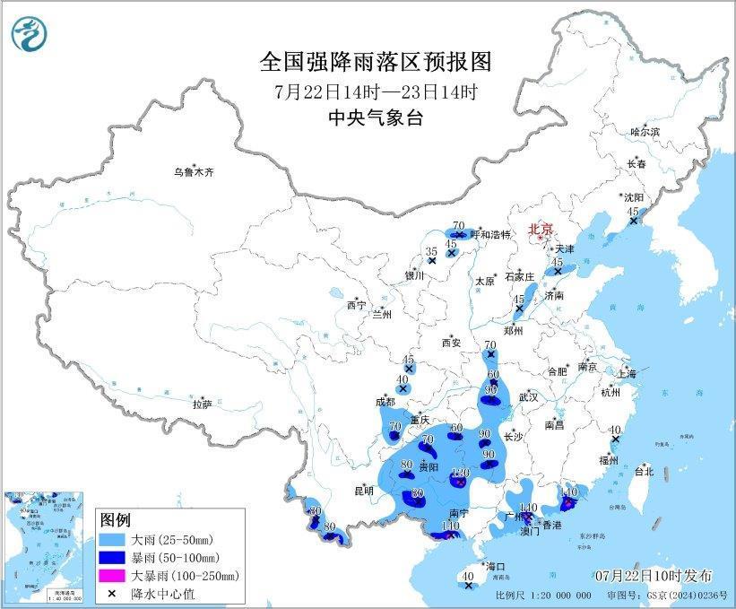 中央氣象臺今日(22日)10時繼續發布暴雨藍色預警:預計,7月22日14時至23日14時,海南島南部、廣東中南部、香港、澳門、福建東南部、廣西中西部、云南東部和西南部、貴州、湖南中西部、湖北西部、重慶南部、四川盆地中部和南部以及山東西北部、河南北部和西南部、內蒙古河套地區等地的部分地區有大到暴雨,其中,廣東南部、廣西北部和南部沿海等地局地有大暴雨(100-140毫米)。上述部分地區伴有短時強降水(最大小時降雨量20-50毫米,局地可超過70毫米),局地有雷暴大風等強對流天氣。