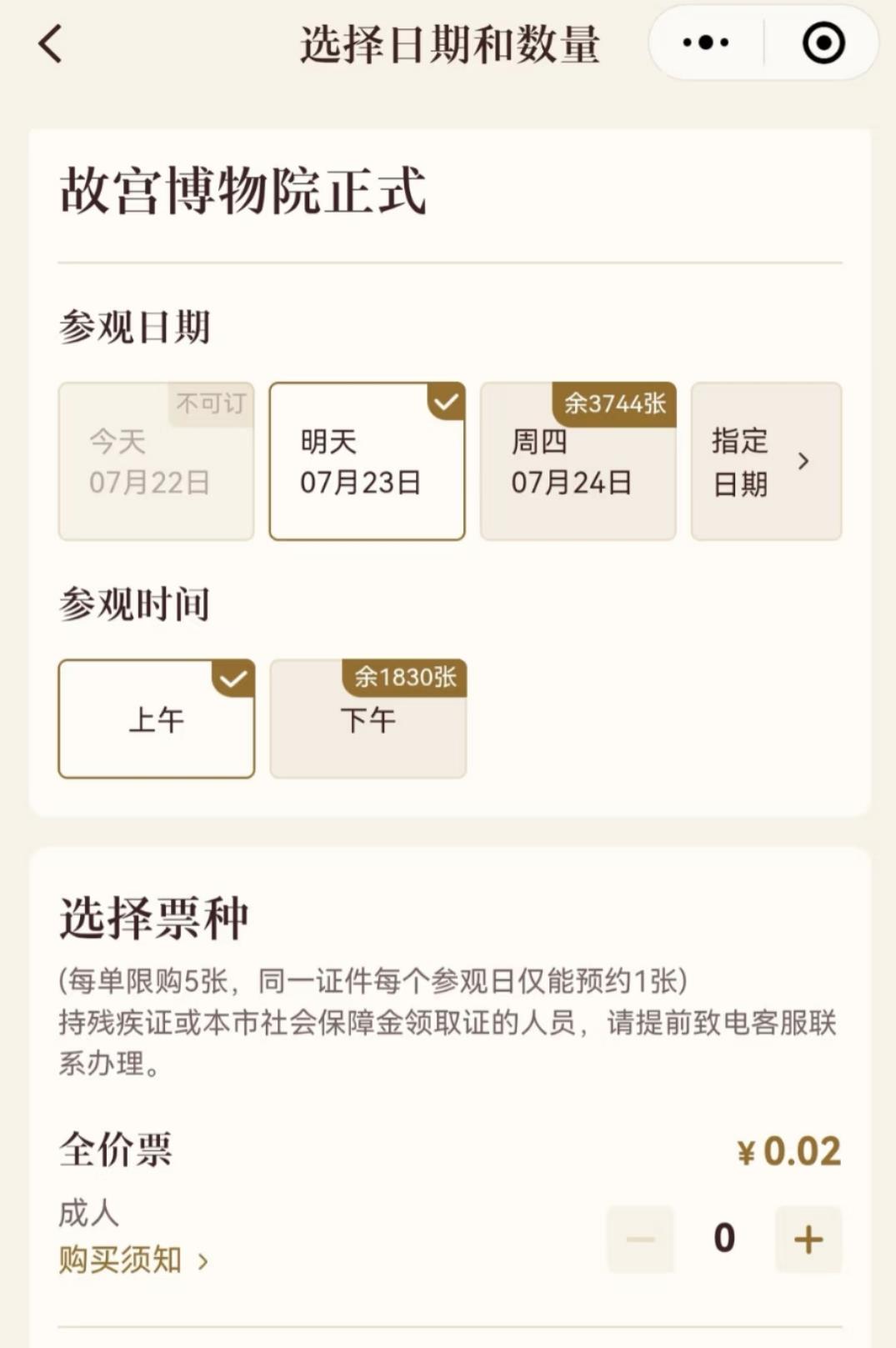 據網友發帖,在22日凌晨2時左右,故宮多項門票僅售0.02元,包括旺季原價60元的門票,以及珍寶館與鐘表館10元的展覽門票。22日上午,故宮博物院回應,凌晨因購票小程序升級時出現異常,導致7月22日至7月28日的票額、票種、票價顯示錯誤。目前,小程序功能已恢復正常。故宮表示,將盡快通過客服電話與在此異常時段內購票的觀眾聯系,重新生成正確訂單,保障觀眾的參觀權益。