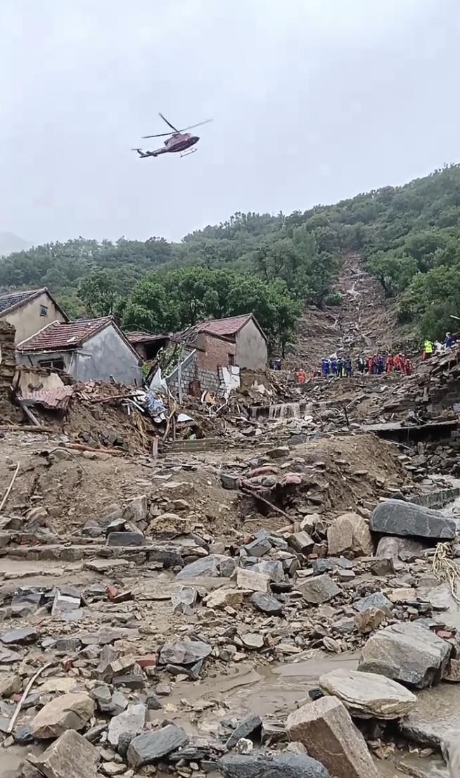 石屋子村村民拍攝的現(xiàn)場畫面顯示,村內(nèi)多處山間房屋已被沖毀,遍地是亂石和雜物,有村民家中滿是淤泥。直升機(jī)在村子上空盤旋,多名救援人員正在開展搜救等相關(guān)工作。