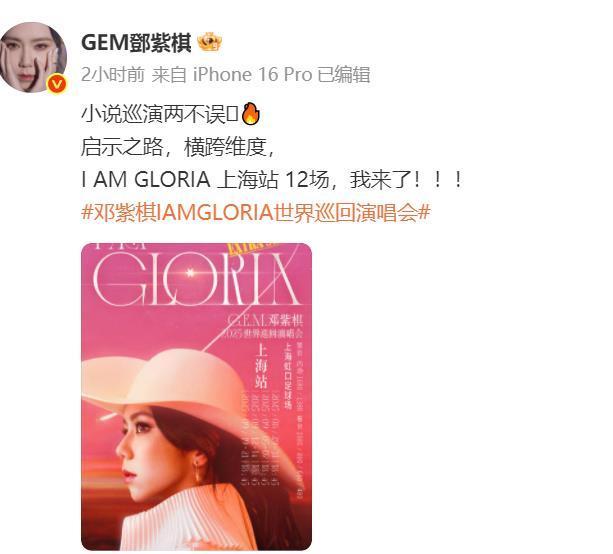 7月22日,歌手鄧紫棋在社交平臺上發(fā)文:“I AM GLORIA 上海站 12場,我來了!”演出地點是上海虹口足球場,日期為2025年8月29-31日,9月5-7日、12-14日、19-21日。