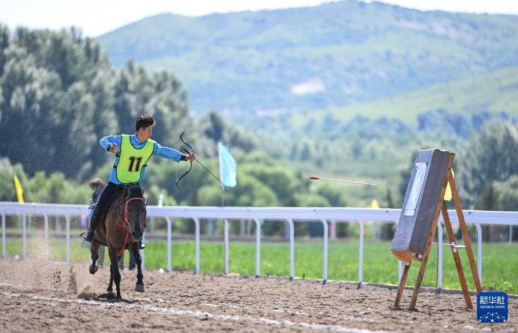 7月22日,呼和浩特市代表隊騎手特日棍在比賽中射箭。最終,他獲得一等獎。新華社記者 貝赫 攝