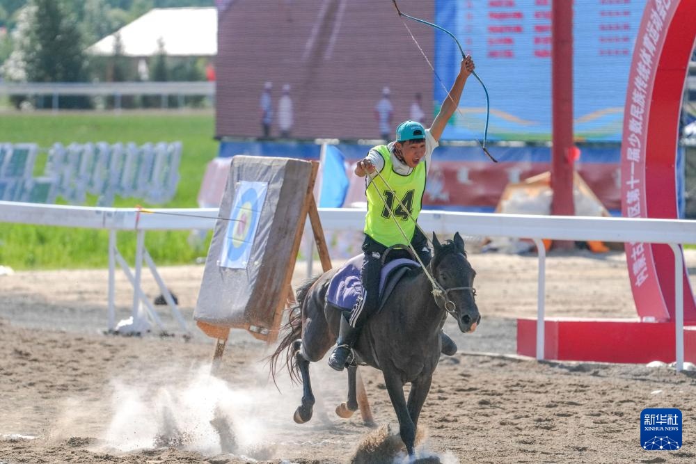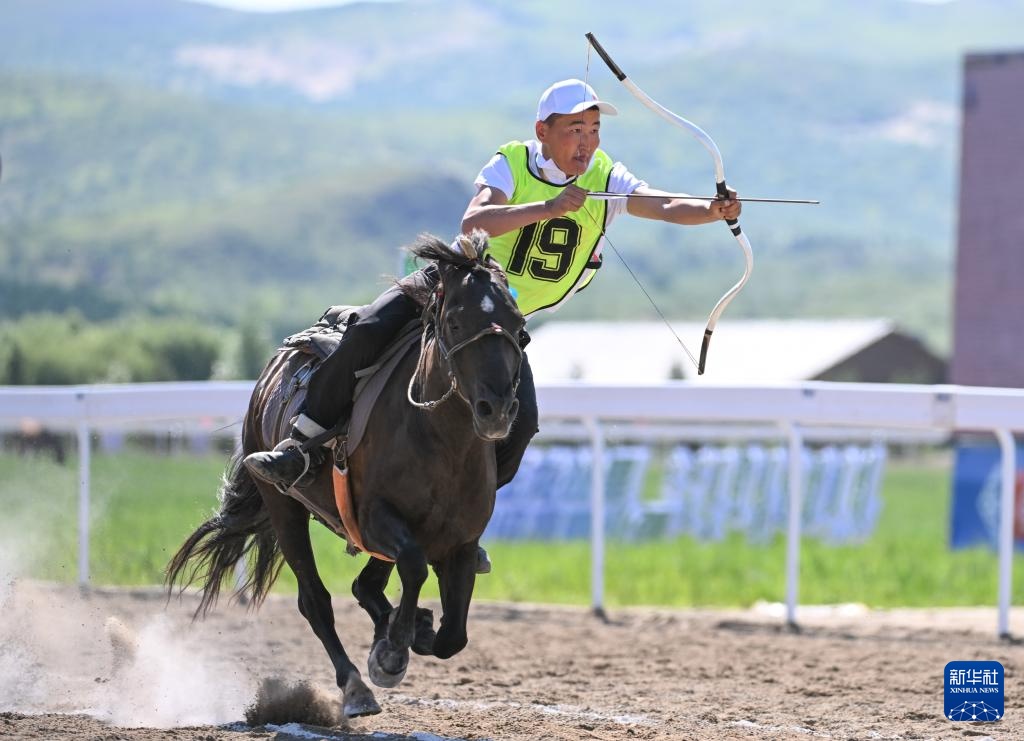 7月22日,赤峰市代表隊騎手阿拉騰布日古德在比賽中射箭。新華社記者 貝赫 攝