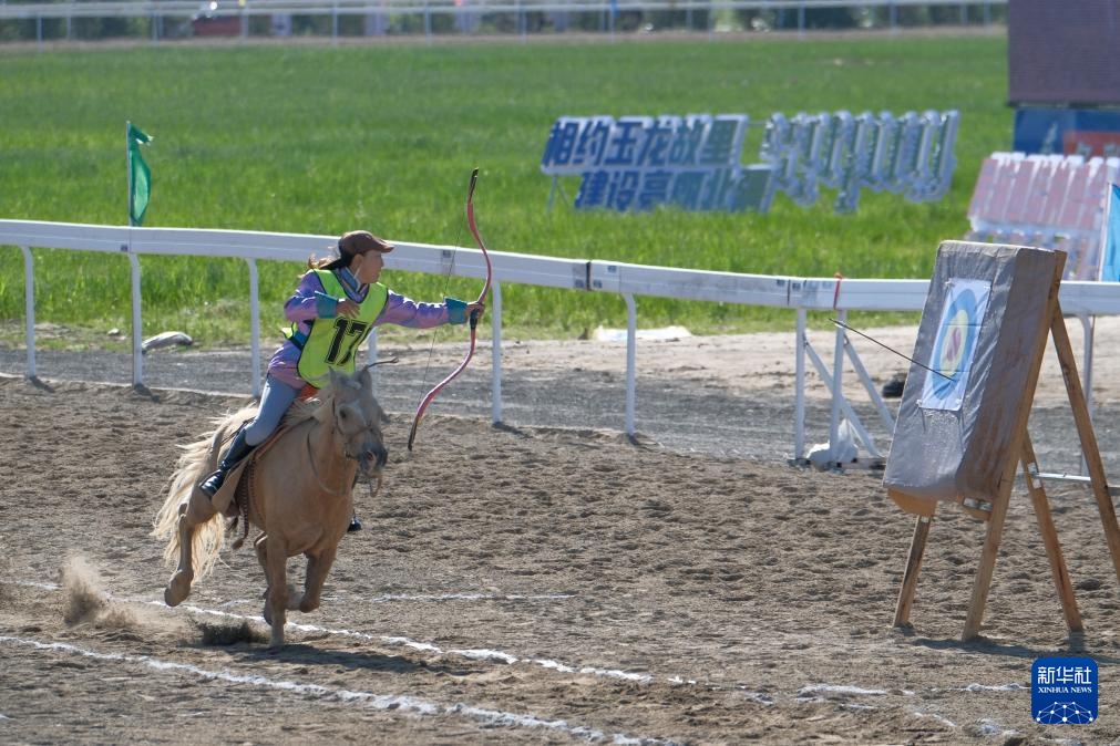 7月22日,巴彥淖爾市代表隊騎手贊登格日樂在比賽中拉弓射箭。她是本次比賽中唯一的女騎手。新華社記者 馬金瑞 攝