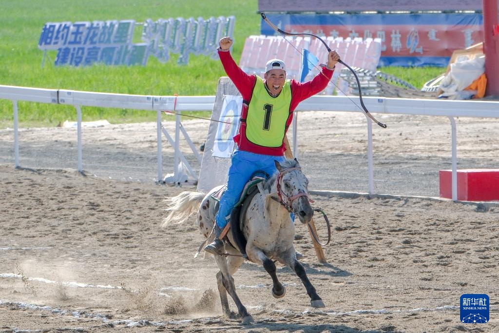 7月22日,錫林郭勒盟代表隊騎手溫都蘇在命中靶心后慶祝。新華社發(fā)(李心逸 攝)