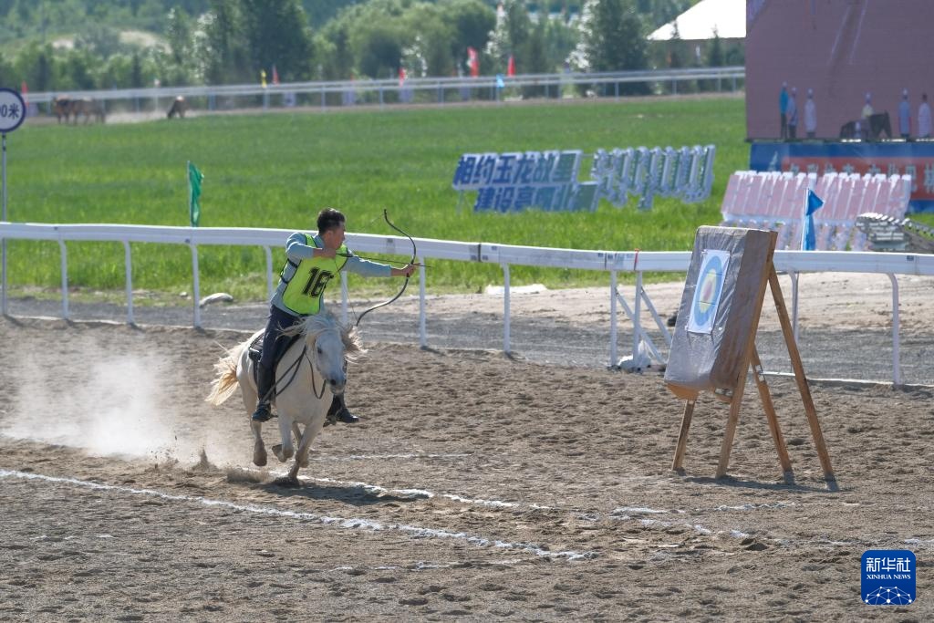 7月22日,呼和浩特市代表隊騎手特日格勒在比賽中拉弓射箭。最終,他獲得二等獎。新華社記者 馬金瑞 攝