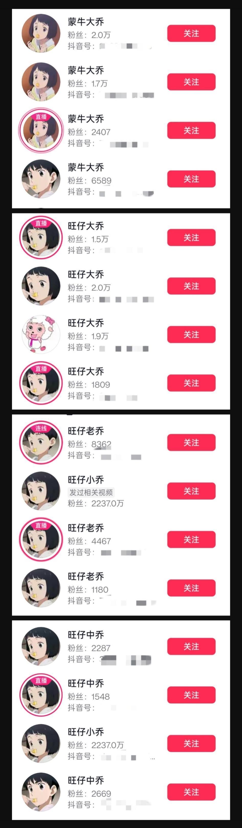 目前,平臺(tái)搜索“旺仔大喬”等昵稱時(shí),會(huì)出現(xiàn)大量相同名字的賬號(hào),粉絲數(shù)量有幾萬的,也有個(gè)位數(shù)的。頭像大多與旺仔小喬相同。