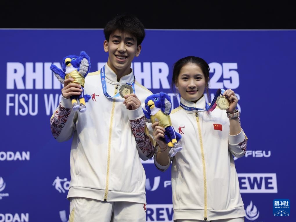 當日,在德國柏林舉行的2025年萊茵-魯爾世界大學生夏季運動會混合雙人十米臺決賽中,中國組合鄭鈞之/王偉瑩獲得冠軍。