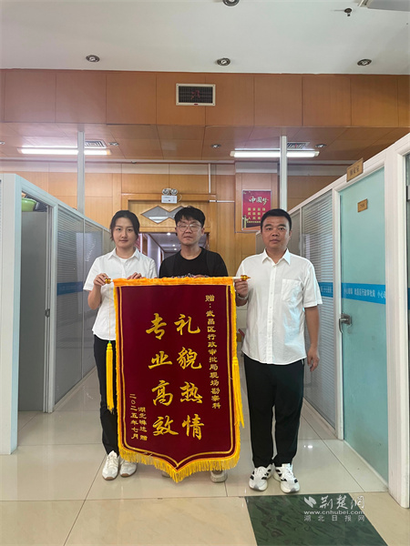 荊楚網(wǎng)(湖北日報(bào)網(wǎng))訊(張俊、李美林)“本以為要拖很久,沒想到你們這么給力!”7月21日,湖北瞬達(dá)企業(yè)服務(wù)有限公司鄭先生冒著酷暑,將一面寫有“禮貌熱情,專業(yè)高效”的錦旗送到武昌區(qū)行政審批局,感謝工作人員使用遠(yuǎn)程視頻核查的方式,幾分鐘就解決了企業(yè)法人出差無法到場的難題。