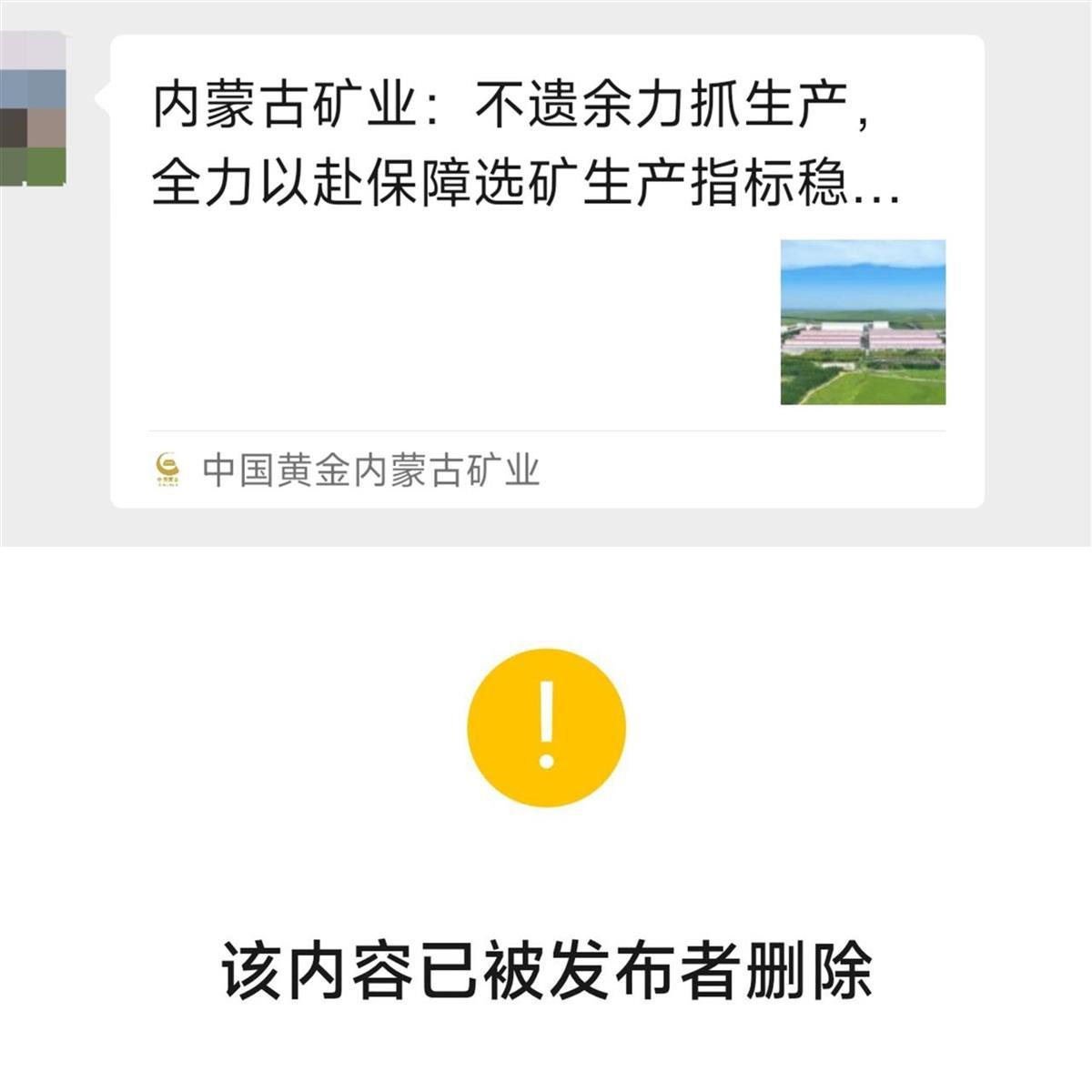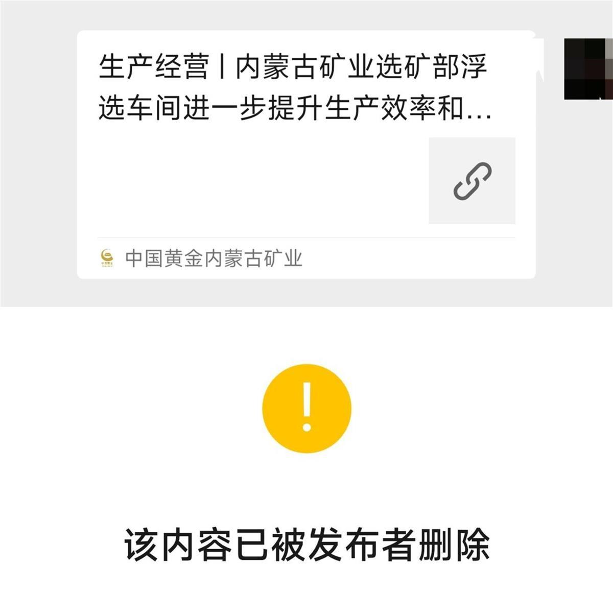 另外,7月8日,上述官微發布的文章《內蒙古礦業:不遺余力抓生產,全力以赴保障選礦生產指標穩定攀升》也刪除了。