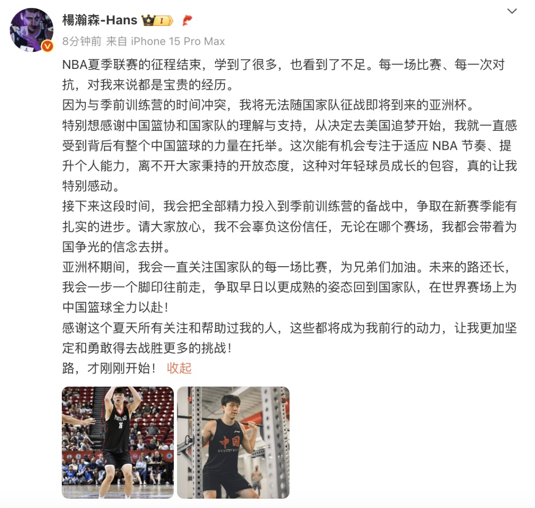 因為與季前訓練營的時間沖突,我將無法隨國家隊征戰即將到來的亞洲杯。特別想感謝中國籃協和國家隊的理解與支持,從決定去美國追夢開始,我就一直感受到背后有整個中國籃球的力量在托舉。這次能有機會專注于適應NBA節奏、提升個人能力,離不開大家秉持的開放態度,這種對年輕球員成長的包容,真的讓我特別感動。接下來這段時間,我會把全部精力投入到季前訓練營的備戰中,爭取在新賽季能有扎實的進步。請大家放心,我不會辜負這份信任,無論在哪個賽場,我都會帶著為國爭光的信念去拼。亞洲杯期間,我會一直關注國家隊的每一場比賽,為兄弟們加油。未來的路還長,我會一步一個腳印往前走,爭取早日以更成熟的姿態回到國家隊,在世界賽場上為中國籃球全力以赴!感謝這個夏天所有關注和幫助過我的人,這些都將成為我前行的動力,讓我更加堅定和勇敢地去戰勝更多的挑戰!路,才剛剛開始!”