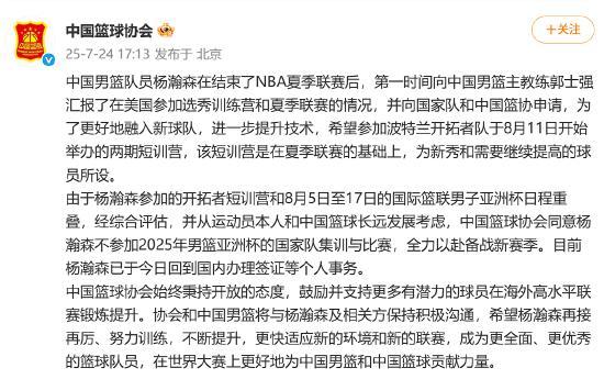 由于楊瀚森參加的開拓者短訓營和8月5日至17日的國際籃聯男子亞洲杯日程重疊,經綜合評估,并從運動員本人和中國籃球長遠發展考慮,中國籃球協會同意楊瀚森不參加2025年男籃亞洲杯的國家隊集訓與比賽,全力以赴備戰新賽季。目前楊瀚森已于今日回到國內辦理簽證等個人事務。