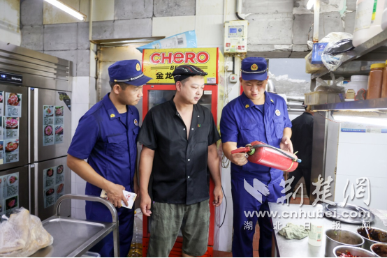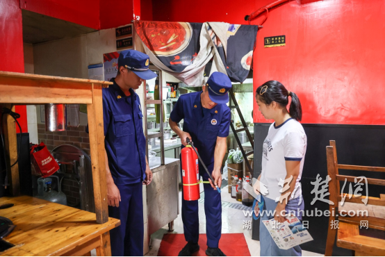 “老板,您后廚的滅火器壓力不足,高溫天里可不能‘偷懶’,得趕緊更換新的!”在一家餐飲店,消防員指著即將過期的滅火器,一邊向店員說明隱患危害,一邊現場演示按壓、噴射等操作要領,直到店員熟練掌握后才放心離開。檢查中,消防員們逐店查看消防設施、疏散通道、用電用氣等情況,對發現的問題“點對點”提醒整改。