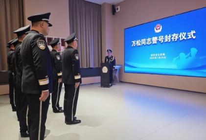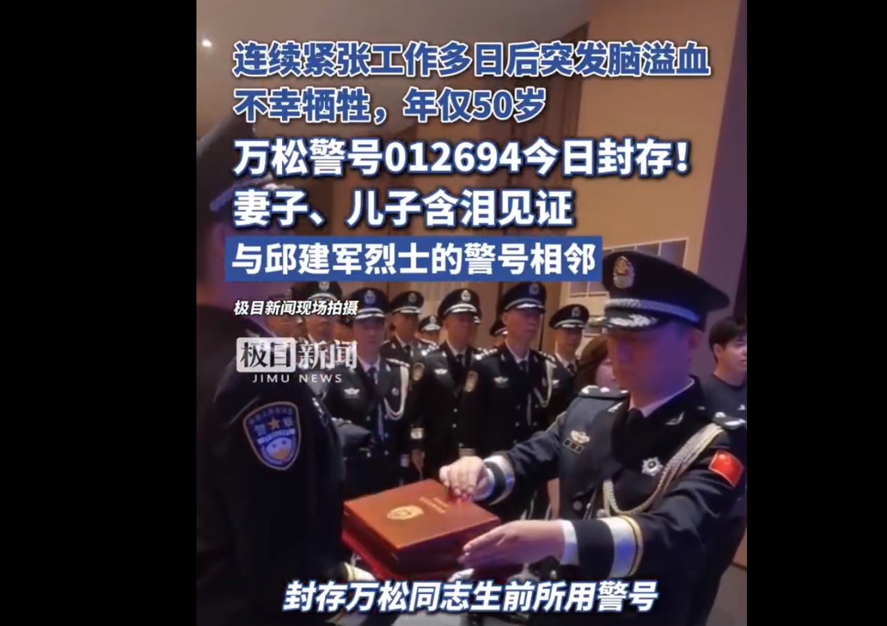 7月25日上午,武漢市公安局在黨建中心舉行儀式,萬松警號012694正式封存,與邱建軍烈士的警號相鄰。5月26日,萬松被同事發現在辦公室內昏迷不醒。5月27日凌晨,經搶救無效不幸因公犧牲,年僅50歲。