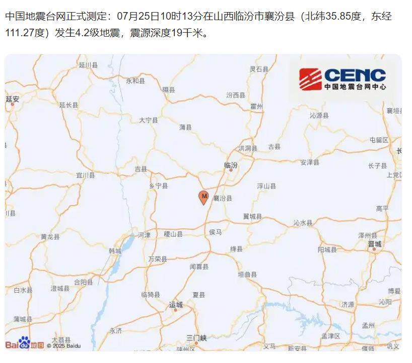 中國地震臺(tái)網(wǎng)正式測(cè)定:7月25日10時(shí)13分在山西臨汾市襄汾縣(北緯35.85度,東經(jīng)111.27度)發(fā)生4.2級(jí)地震,震源深度19千米。