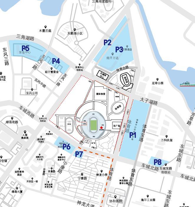 (3)乘坐公交至東風(fēng)大道三角湖路站,沿東風(fēng)大道—太子湖路—體育路線路前往體育中心3、4、5號門觀眾出入口。