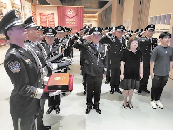 “敬禮!”一聲令下,現(xiàn)場(chǎng)民警齊刷刷舉起右手,向昔日并肩戰(zhàn)斗的戰(zhàn)友致敬。激昂雄壯的《中國(guó)人民警察警歌》隨即響起。歌聲中,大家目送警號(hào)012694被移送至市公安局黨建中心英模英烈事跡展示廳存放。
