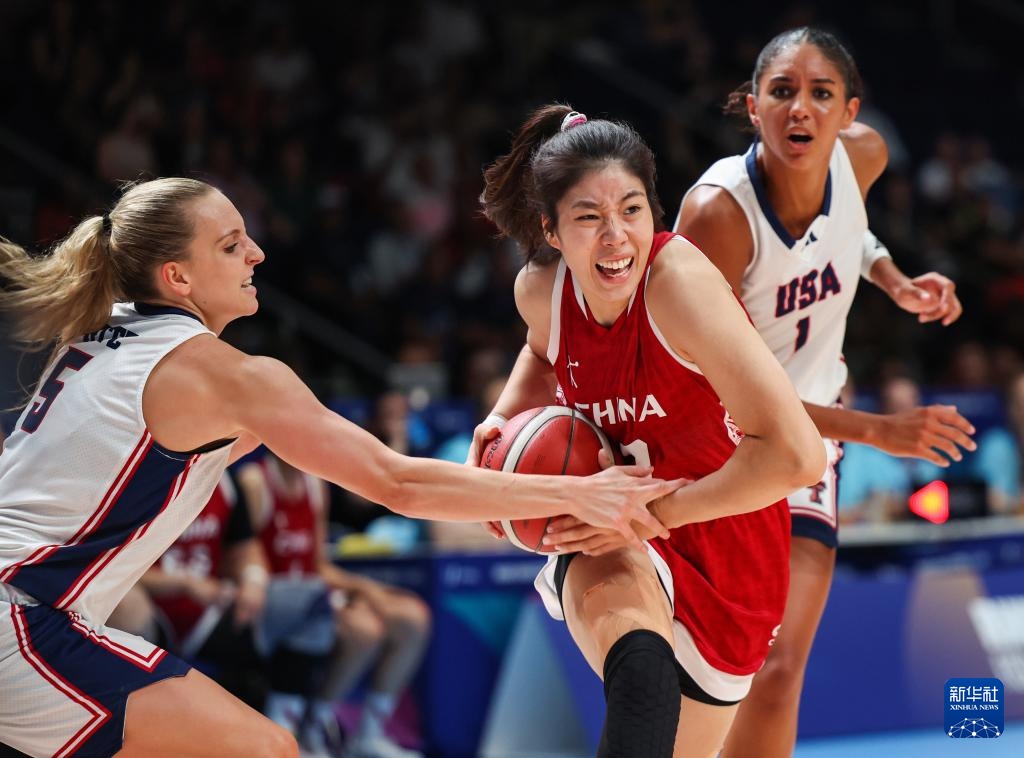 7月25日,中國隊球員李星諾(左)、田媛媛(右)防守美國隊球員布萊克洛克。