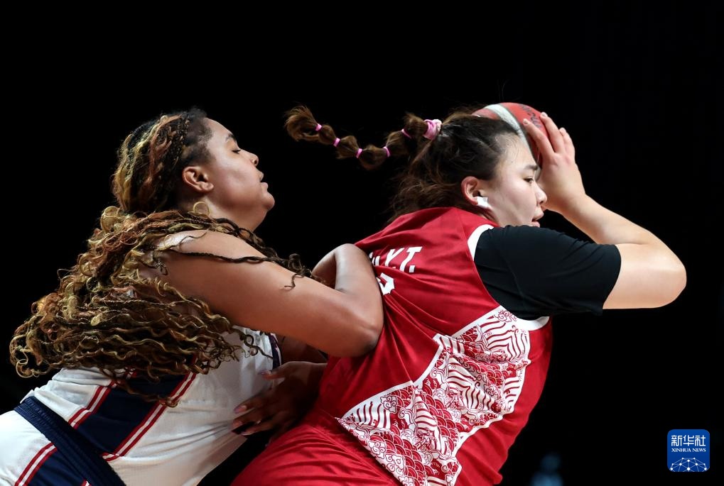 7月25日,中國隊球員劉禹彤(右)在美國隊球員馬隆防守下進攻。