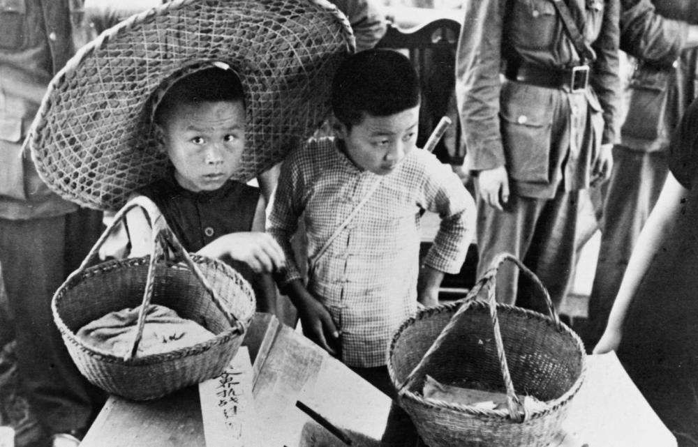 1938年7月7日,武漢民眾開展抗日獻金運動。這是賣白蘭花的兒童把售花所得獻給抗日運動。 新華社發