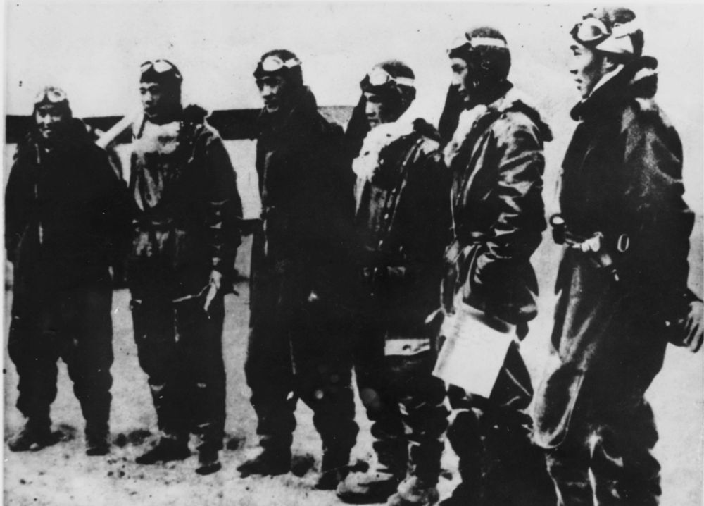 武漢空戰中部分有功飛行員在王家墩機場。 湖北省檔案館 供圖