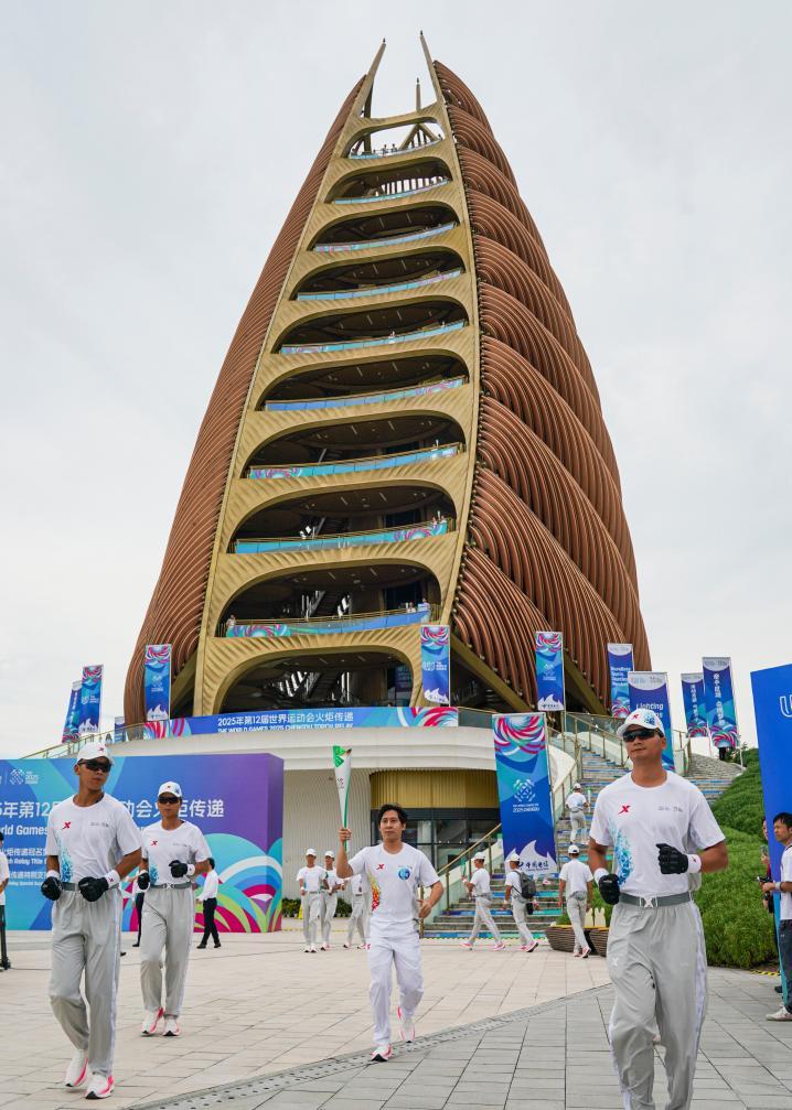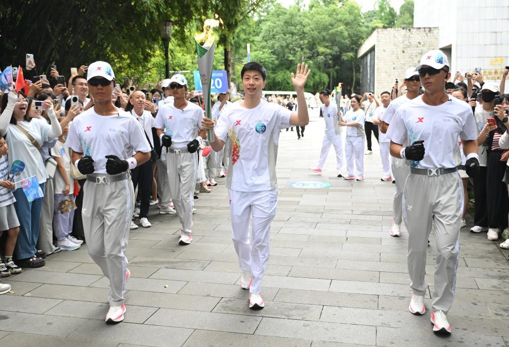↑2025年7月26日,火炬手鄒敬園在金沙遺址博物館傳遞火炬。新華社記者 陳誠 攝