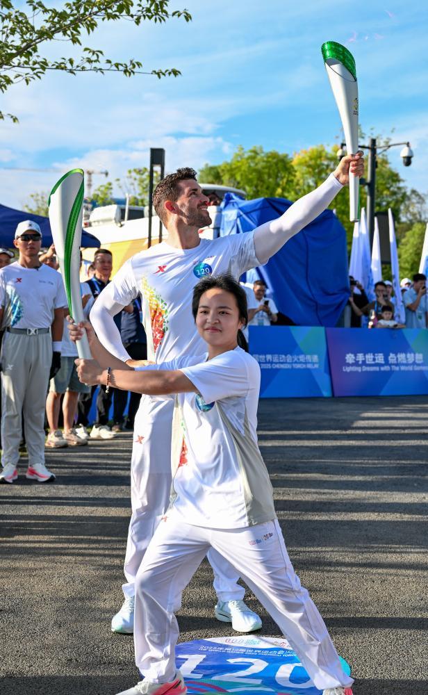 ↑2025年7月26日,火炬手劉清漪(前)與最后一棒火炬手馬塞爾·哈塞邁爾交接火炬。新華社記者 馮開華 攝