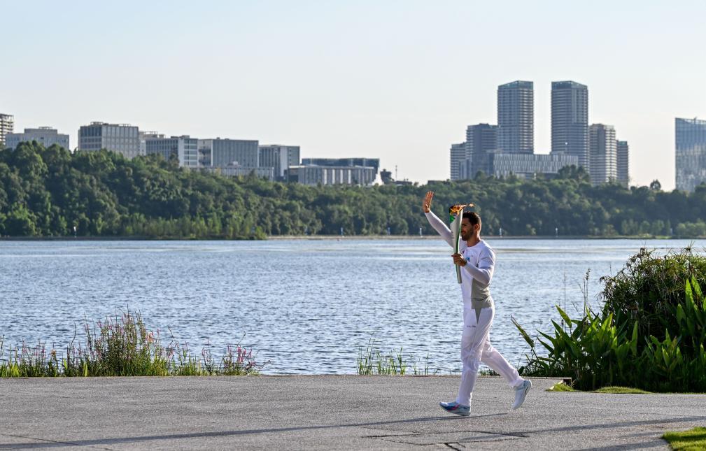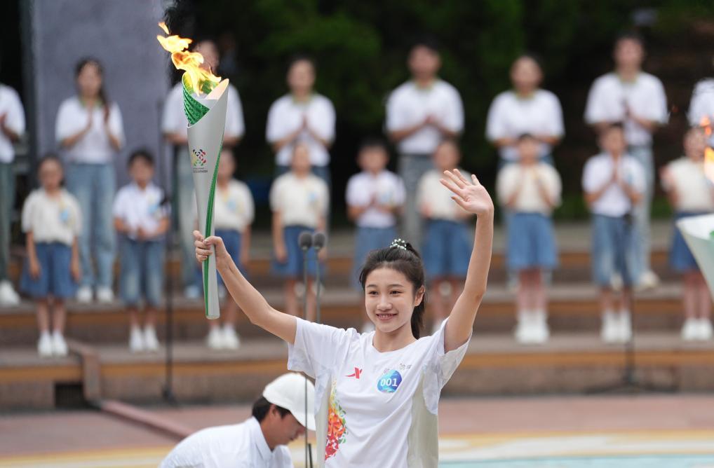 ↑2025年7月26日,第一棒火炬手黃張嘉洋在傳遞火炬。新華社記者 江宏景 攝