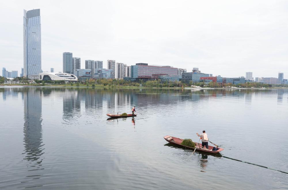 ↑在四川天府新區興隆湖,工作人員在撈水草(2022年9月21日攝)。新華社記者 江宏景 攝