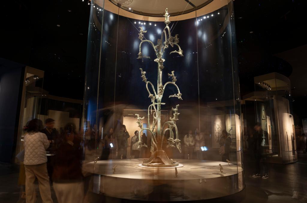 ↑參觀者在三星堆博物館觀看青銅神樹(2024年12月18日攝)。新華社記者 才揚 攝
