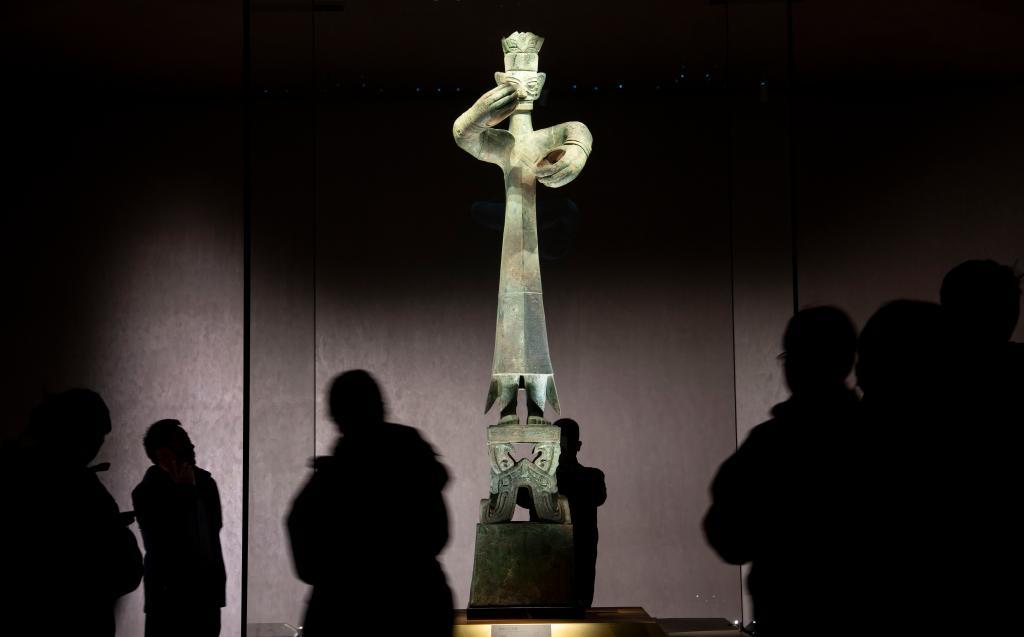 ↑觀眾在三星堆博物館展廳內參觀青銅大立人像(2024年12月18日攝)。新華社記者 才揚 攝
