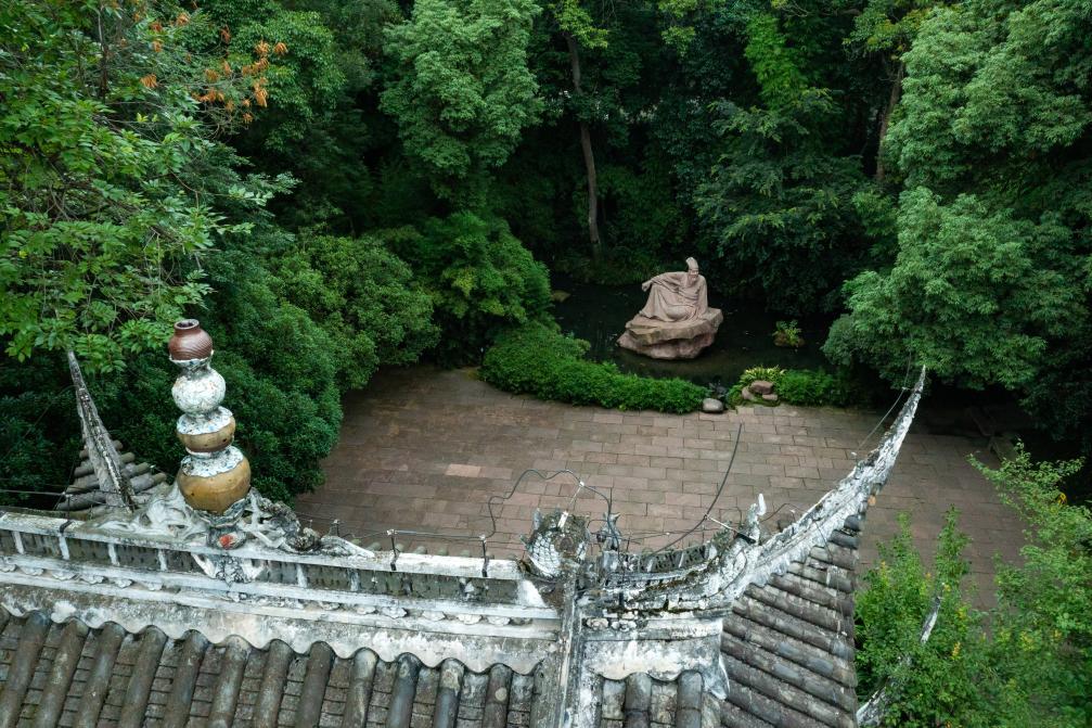 ↑這是無人機拍攝的眉山三蘇祠內的東坡盤陀坐像(上)和披風榭(2022年6月22日攝)。新華社記者 沈伯韓 攝