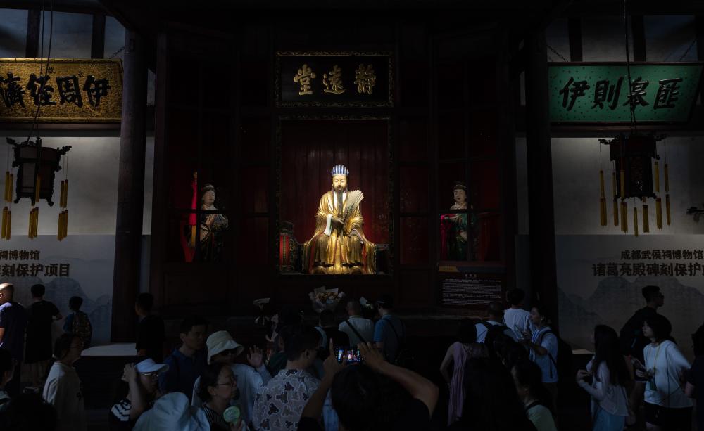 ↑成都武侯祠里的諸葛亮塑像,塑于清康熙11年(公園1672年)(2023年7月19日攝)。新華社記者 江宏景 攝