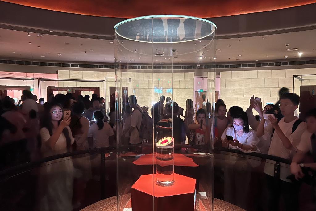 ↑在成都金沙遺址博物館,游客們在觀賞、拍攝太陽神鳥金飾(2024年7月13日攝)。新華社記者 康錦謙 攝