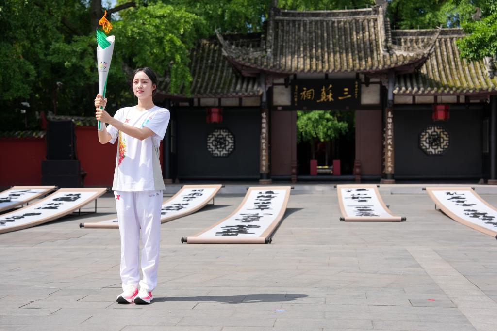 ↑2025年7月26日,火炬手肖雁寧在眉山三蘇祠傳遞火炬。新華社記者 李旭倫 攝