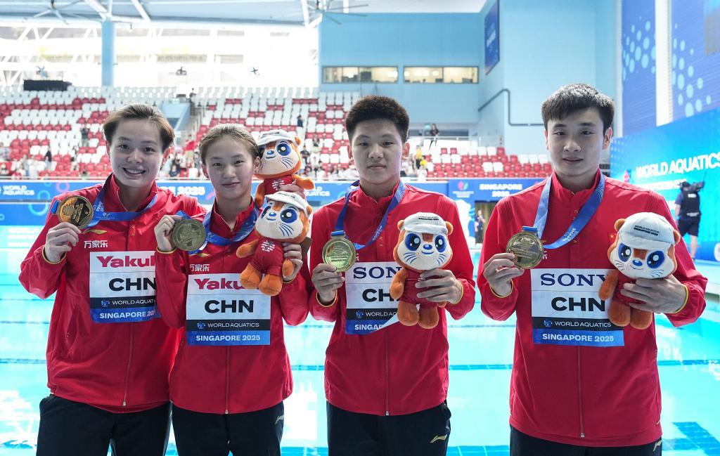 新華社新加坡7月26日電(記者夏亮、李嘉)26日,2025年游泳世錦賽跳水項(xiàng)目迎來首個(gè)比賽日。由陳藝文、陳芋汐、曹緣、程子龍組成的中國(guó)隊(duì)在混合團(tuán)體比賽中以39.95分的領(lǐng)先優(yōu)勢(shì)奪得項(xiàng)目首金,墨西哥和日本隊(duì)分獲銀牌和銅牌。