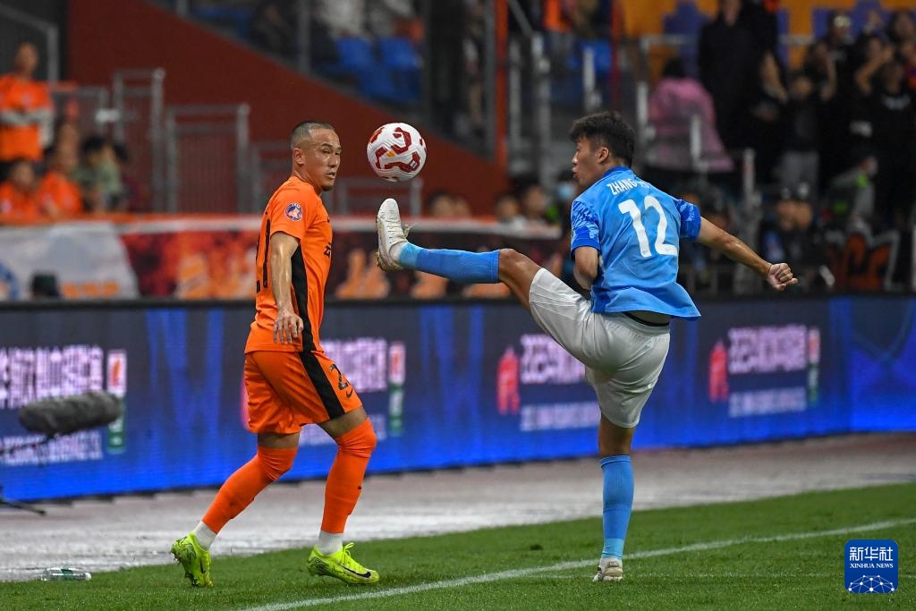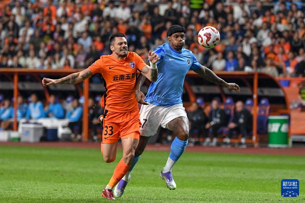 7月26日,云南玉昆隊球員唐淼(左)與深圳新鵬城隊球員姜至鵬在比賽中拼搶。