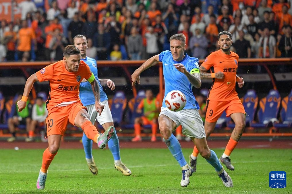 7月26日,云南玉昆隊球員佩德羅·恩里克(右二)在比賽中進球得分。