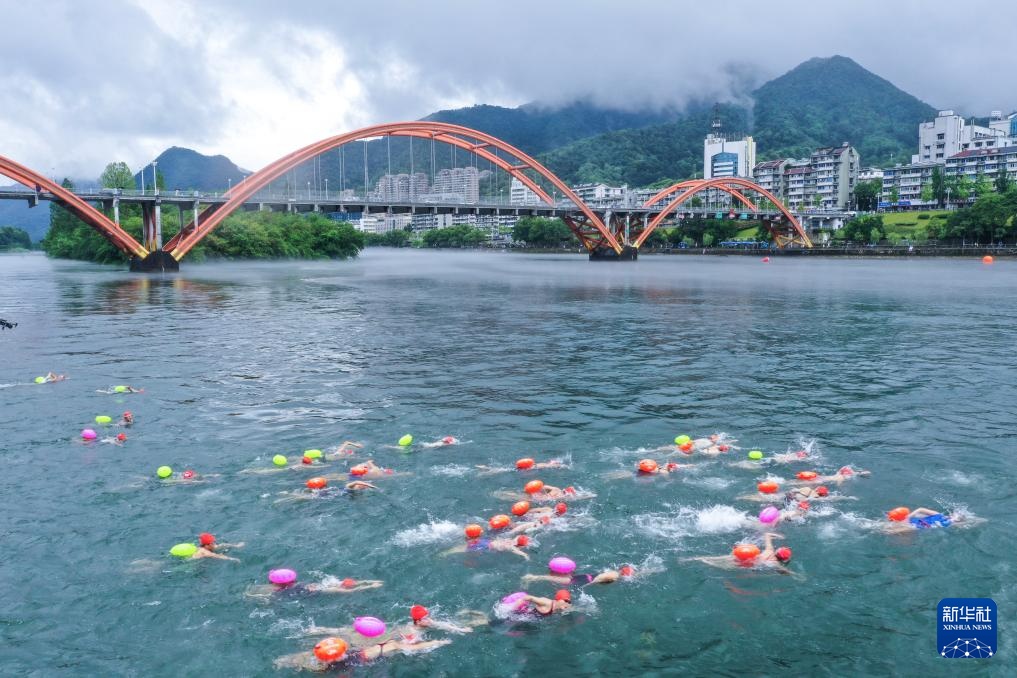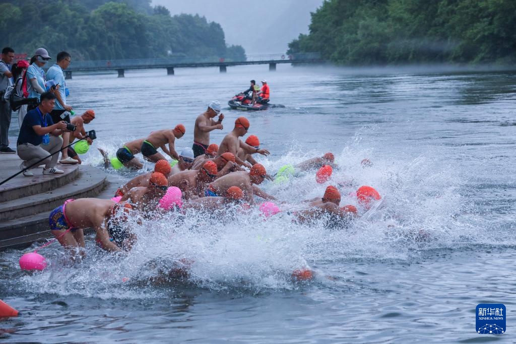 7月27日,參賽選手們躍入新安江中參加“夏日冬泳”。