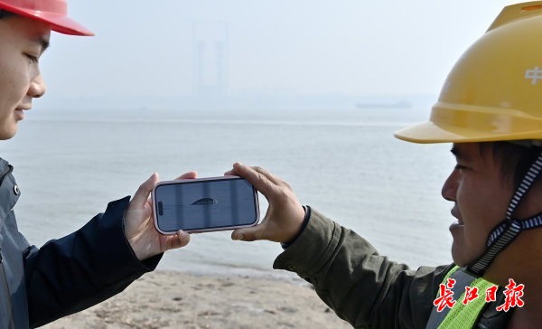 2023年12月27日,雙柳長江大橋建設者廖吉學向工友們展示他用手機拍到的長江江豚逐浪嬉戲的照片。