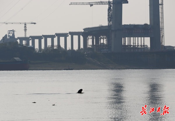 2024年11月21日,一頭長江江豚正從在建的雙柳長江大橋附近迎浪捕食。