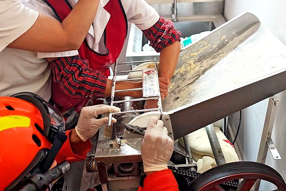 很快,消防救援人員與120醫護人員一同趕到現場。此時,被卡女子正因疼痛緊蹙眉頭,左手手掌被壓面機滾軸擠壓,已有鮮血滲出,滾軸的咬合力度讓她不敢輕易動彈。消防救援人員迅速觀察現場情況,確定需通過破拆設備擴張滾軸空間,才能安全取出手掌。