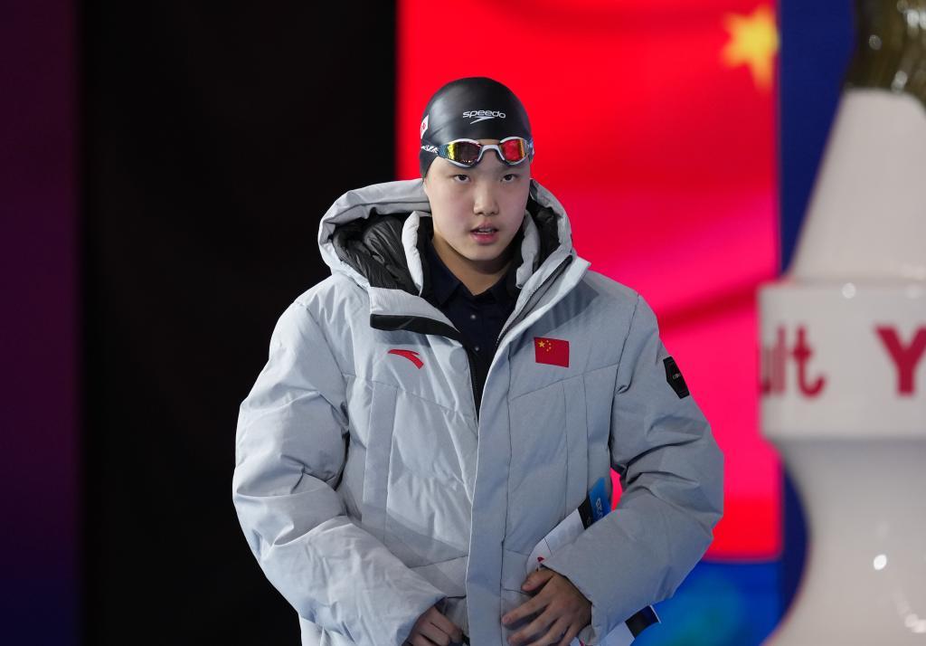 ↑7月27日,中國(guó)選手于子迪在世界游泳錦標(biāo)賽游泳女子200米混合泳半決賽前入場(chǎng)。新華社記者 伍志尊 攝